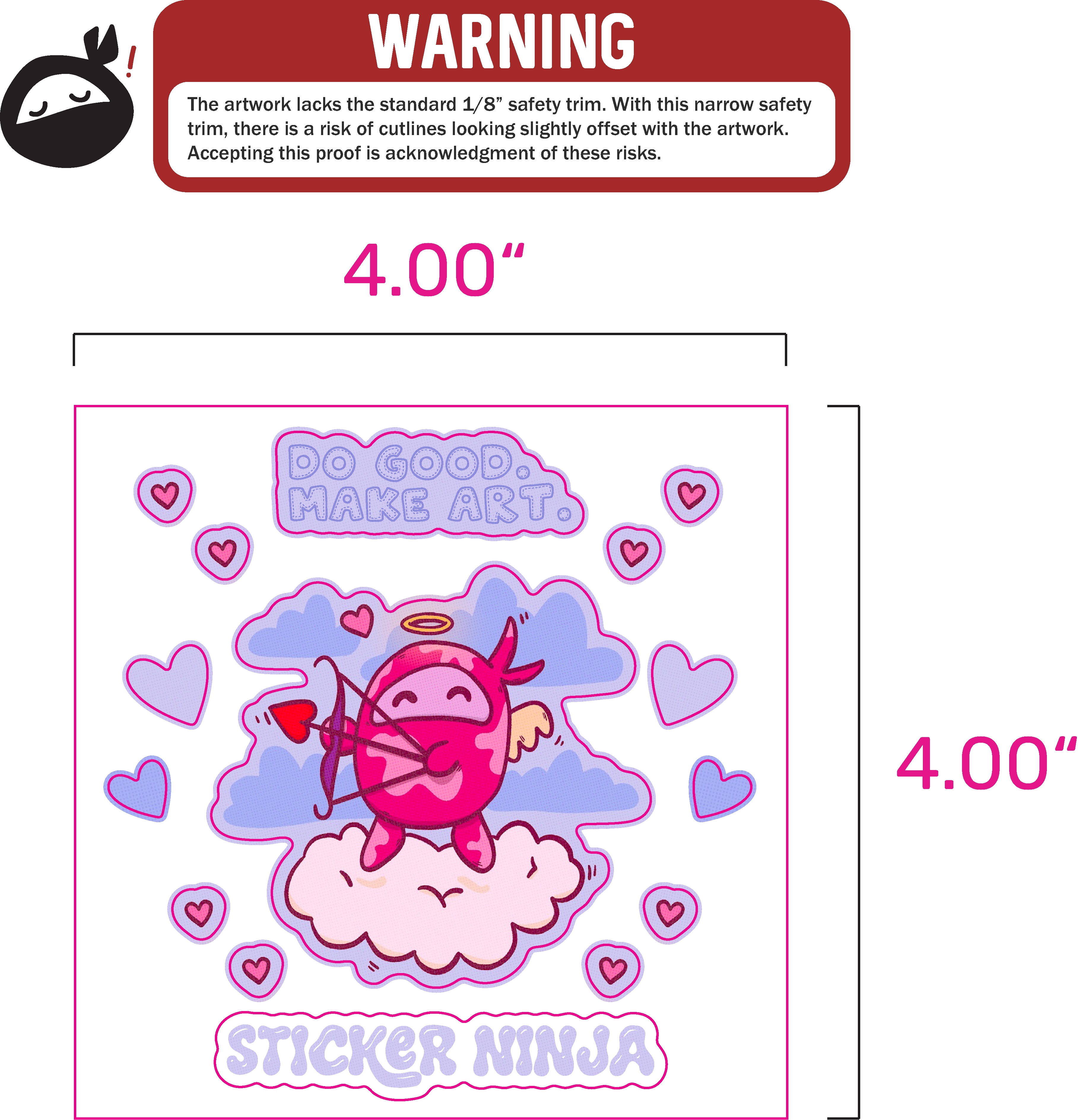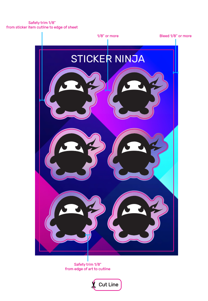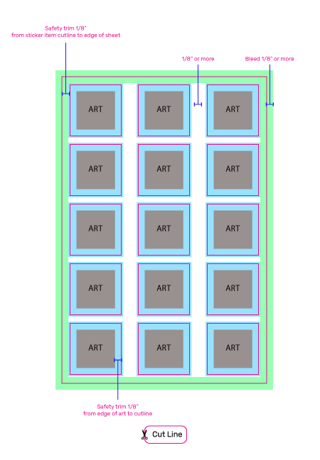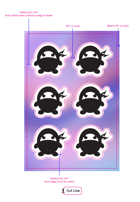 *Our safety trim of 1/8″ (.125″) is our standard so stickers do not look visually offset once printed. It is common for sticker sheets to have slimmer safety trims due to general smaller sizing of sticker items. Any sheets that have a safety trim slimmer than our standard 1/8″ (for either sticker items or sheet) will come with a warning at the top of the proof.